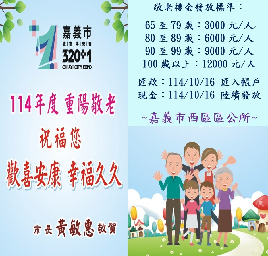 嘉義市114年度重陽節敬老禮金自10月16日起發放至12月1日,發放對象為本市市民於重陽節(國曆10月29日)當日年滿65足歲,設籍本市6個月以上並實際居住之長者。