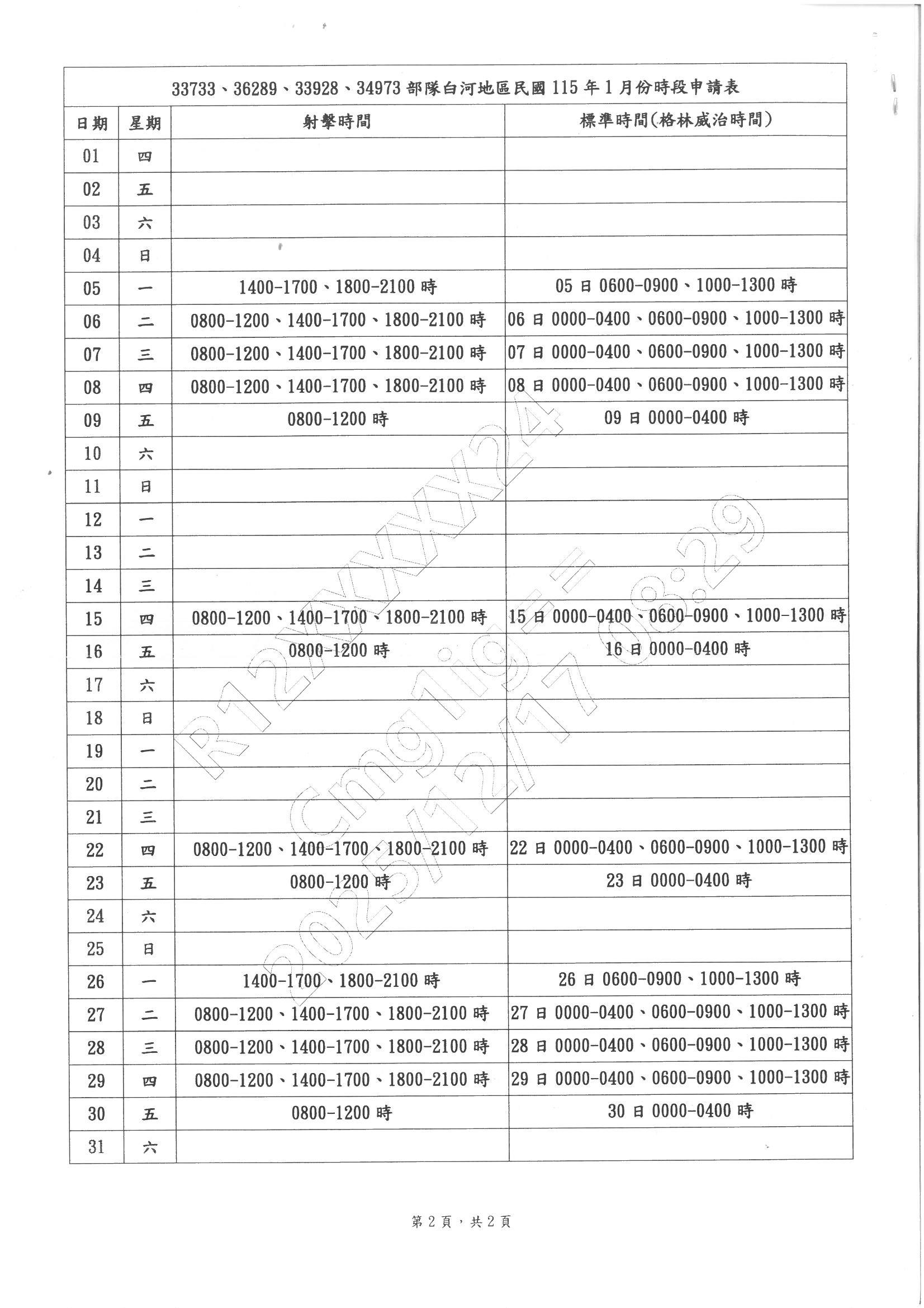 115年1月份實彈訓練時段公告(詳如附件): 1月6~8日、15日、22日、27~29日:8時至21時。 1月9日、16日、23日、30日:8時至12時。 1月5日、26日:14時至21時。