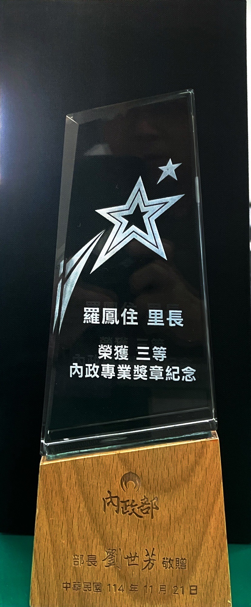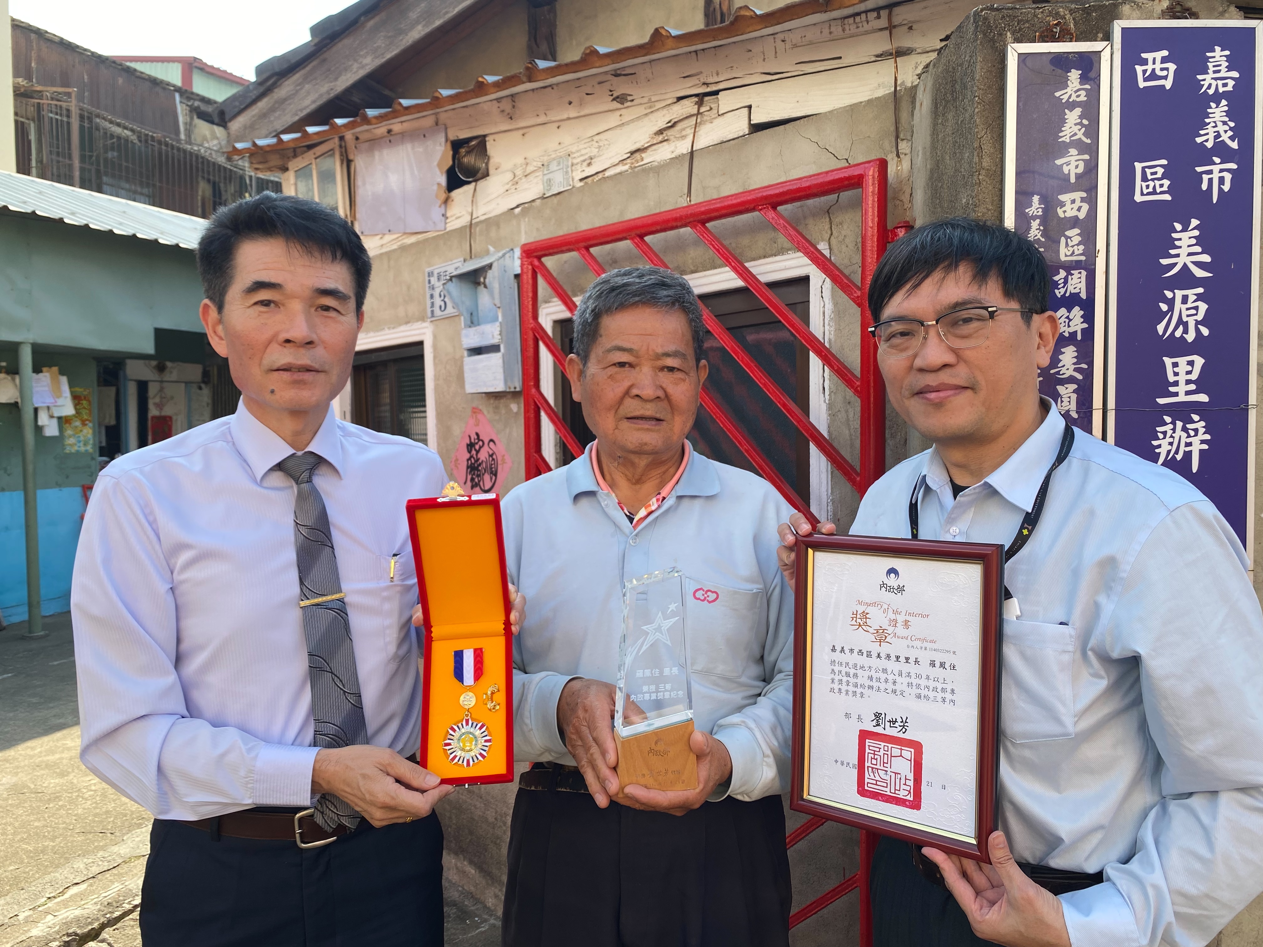 恭喜本區美源里羅鳳住里長榮獲114年度內政部專業獎章,區長柯國振為表彰羅里長服務貢獻,特別親自轉頒內政部「三等內政專業獎章」,肯定其長年深耕地方、造福里民的卓越表現。