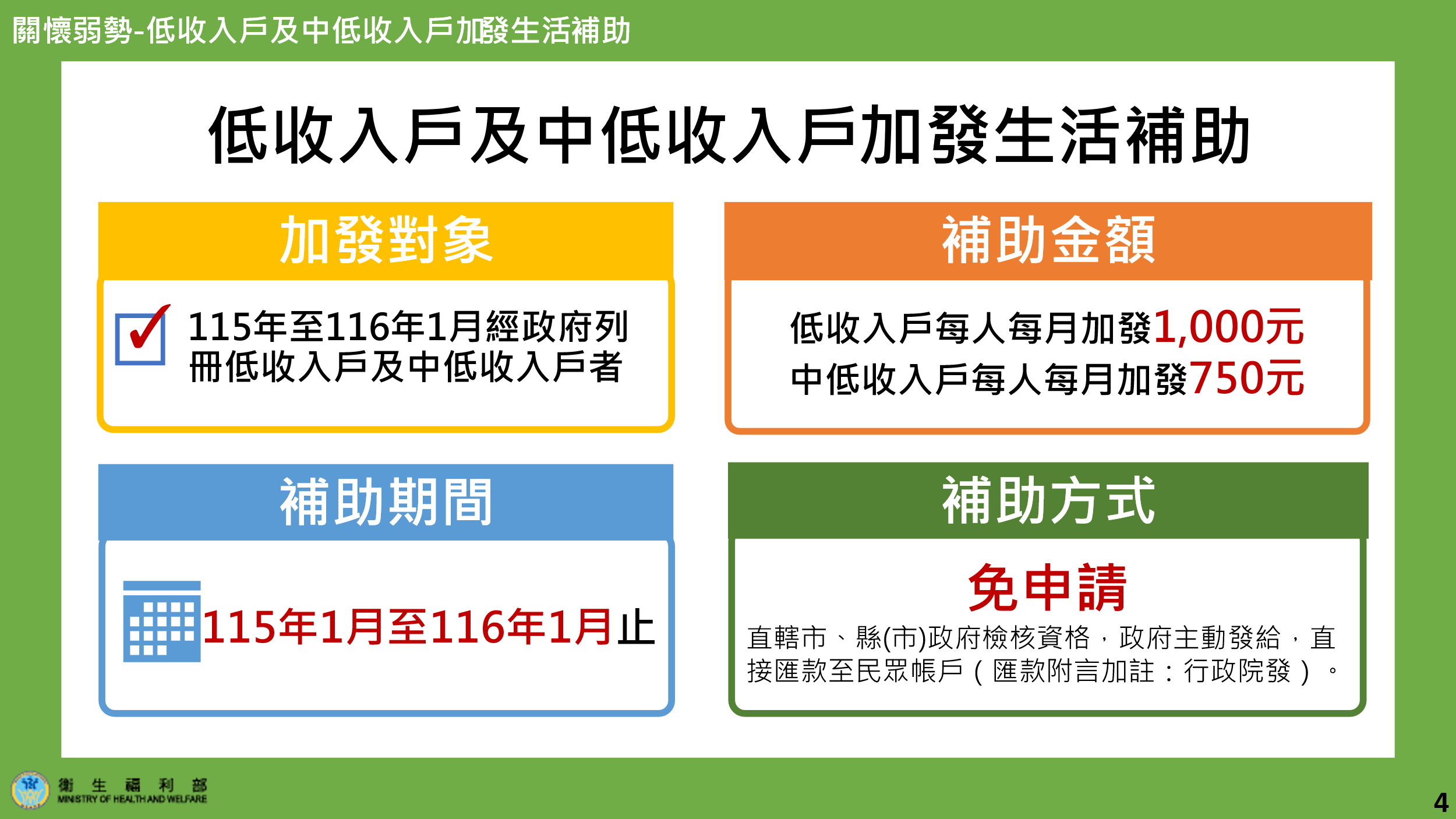 為了及時照顧經濟弱勢族群,自115年1月起至116年1月止共13個月,按月加發生活補助金,對象包含: